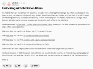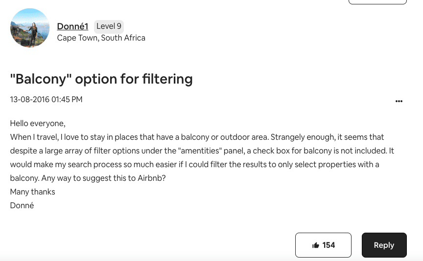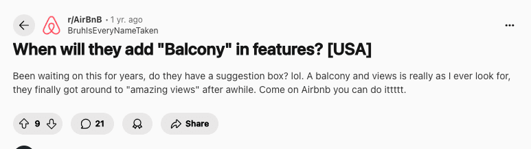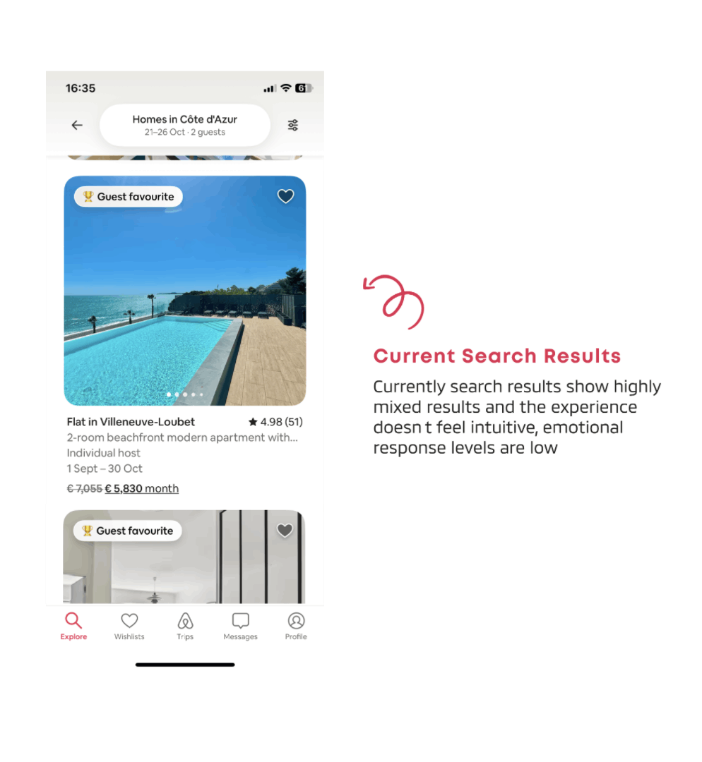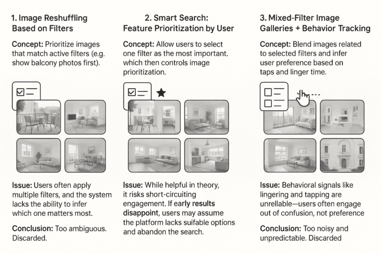 By first resolving a clear user pain point (the missing balcony filter), then gradually introducing more responsive, emotionally aware features, Airbnb can improve both efficiency and engagement in search. The goal is to support decisions with clarity, tone, and structure, building trust and making it easier for guests to find a place that truly fits.