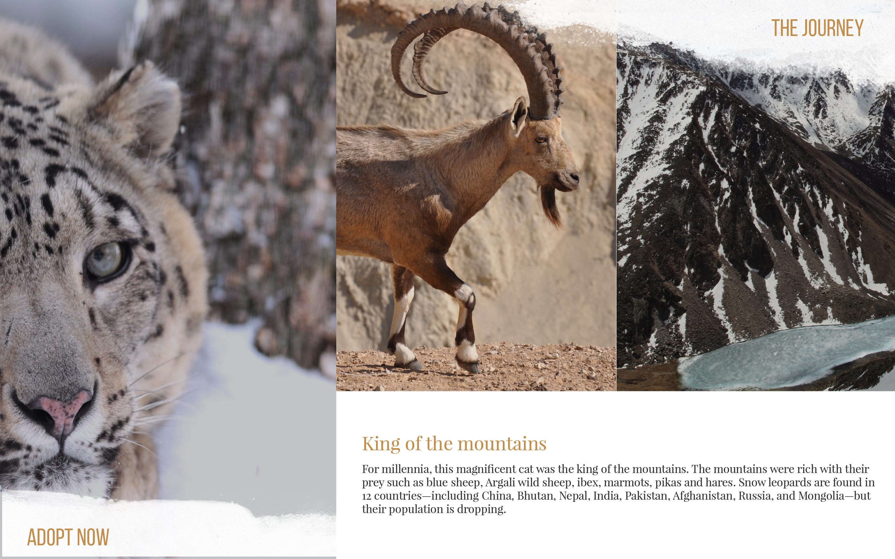 A landing page concept for a non-profit fund dedicated to protecting snow leopards from extinction. The design uses storytelling visuals—scroll-triggered narratives, immersive imagery, and interactive elements—to guide visitors through the leopard’s story, the threats it faces, and how their support can make a difference.